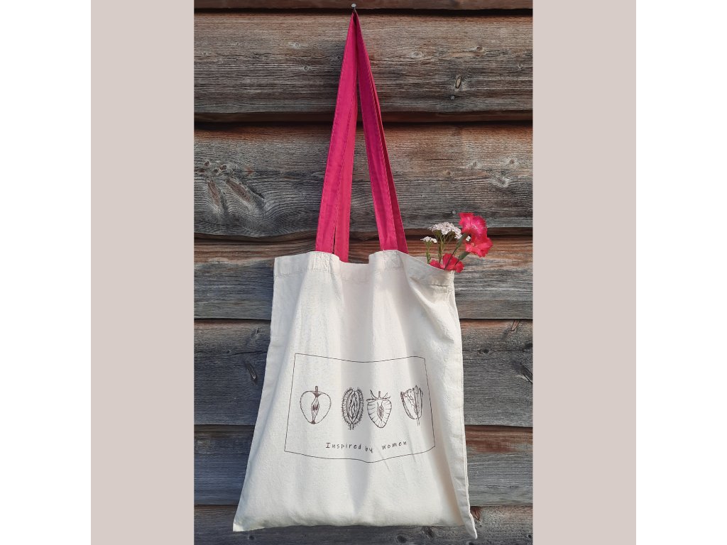 Lehká taška v přírodní barvě s růžovými popruhy a čokoládovým potiskem - jemný design květin a plodů inspirovaný krásou ženy